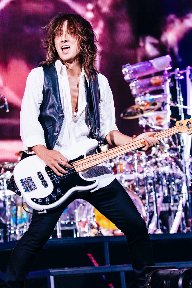 Jが攻撃的なベースを鳴らし、SUGIZOがスロープを全速力で走り、定位置に戻ってソロを弾いた「JESUS」は前半の起爆剤。ステージのLEDヴィジョンが赤く染まり、『MOTHER』の中で最もヘヴィな質感の「FACE TO FACE」はうねるグルーヴが凄まじく宇宙のカオスの中に吸い込まれるようだった。スローなナンバーでも内側で燃えるような熱と緊張感は途切れることがなく、こういう楽曲にドラマを与えられるのはRYUICHIしかいないと改めて思う。