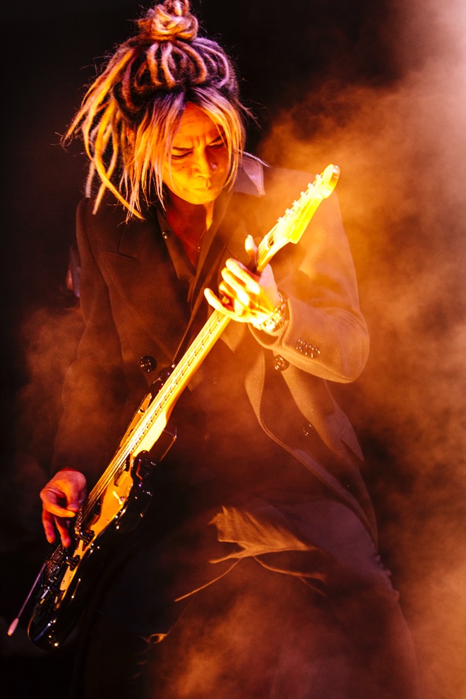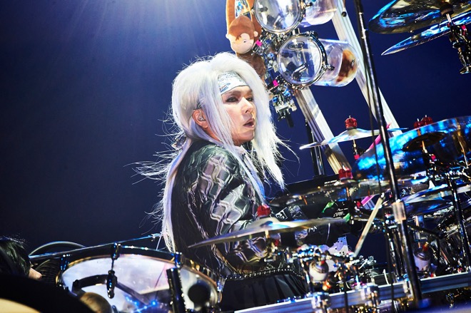 20分の休憩を挟み、初日同様、真矢のドラムソロがスタートするか…と思いきや、真矢に続いてJも登場。Jが1996年の<UN ENDING STYLE>で披露していたリズムセッション「BACK LINE BEAST」のフレーズを弾き始めると、大きな歓声が上がった。横浜スタジアムや東京ドームをライヴハウスに変えてきた熱いセッションが、Kアリーナの一体感を高めていく。「J!」コールと「真矢!」コールが巻き起こる会場を、「飛ばしていくぞー!」とJが煽り、そのまま「Déjàvu」で後半戦に突入した。