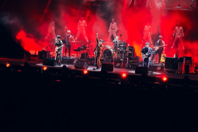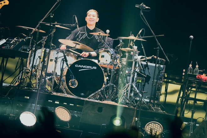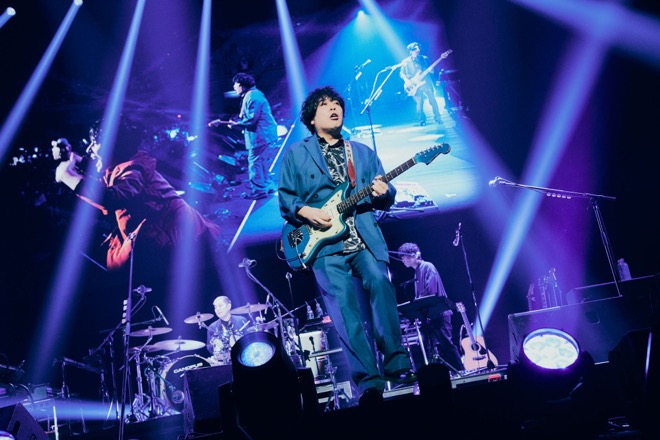 大山田源次郎という架空の音楽評論家に阪井一生(G)が扮し、リモート参加している設定のコミカルなオープニング映像の後、いよいよ本編がスタート。横長の巨大スクリーンに「聴きたい歌はありますか?」と問い掛ける文字が映し出され、楽曲タイトルの数々が浮かび上がっていく。すると、白い胴着に身を包んだ16人の<SINGALONG Special DANCERS>が出現。拳を高く突き上げて「Blue Apple&Red Banana」の《Wow wow》というコーラスを歌い出し、ファンは手拍子を重ねていく。照明が赤になった瞬間、山村、阪井、尼川元気(B)、小倉誠司(Dr)が一列に並んで後方の壇上に登場、大歓声が沸き起こった。