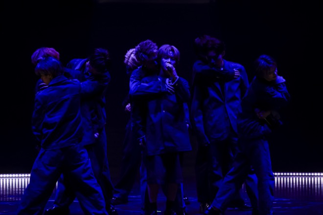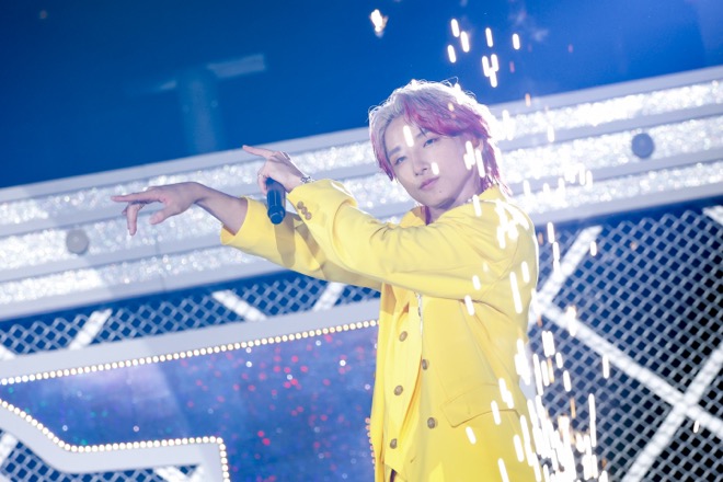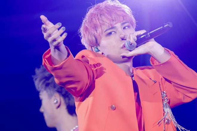 続くブロックは、1曲ごとに全く違った表情を見せ、BUDDiiSというグループの多彩さとポテンシャルの高さを存分に感じさせてくれる時間となっていた。新衣装であるデニムのセットアップに着替え、10月11日にリリースした1stアルバム『BRiLLiANT』のリード曲「Koi to me」を9人で初披露。英語に聴こえる日本語で歌われたシンセポップでは、FUMIYAのラップとMORRIEのパワフルなロングトーンが交錯し、観客の高揚感を引き上げると、FUMINORI、FUMIYA、SHOW、SEIYAの4人によるドープなヒップホップ「Mr.FREAK OUT」では怪しげなムードを醸し出しながら、SEIYAが高速ラップを繰り出し、《俺らダイヤモンド》というフレーズにたどり着く。さらに、変則的なビートのアブストラクトなトラックとのシンクロダンスからブレイキンへと移行していくダンスで魅せると、メドレーでは一転して、場内が明るくなり、観客と一緒に歌い、拳を上げ、手を左右に振って盛り上げ、会場の一体感を高めていった。