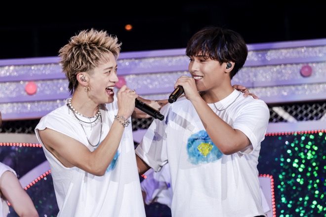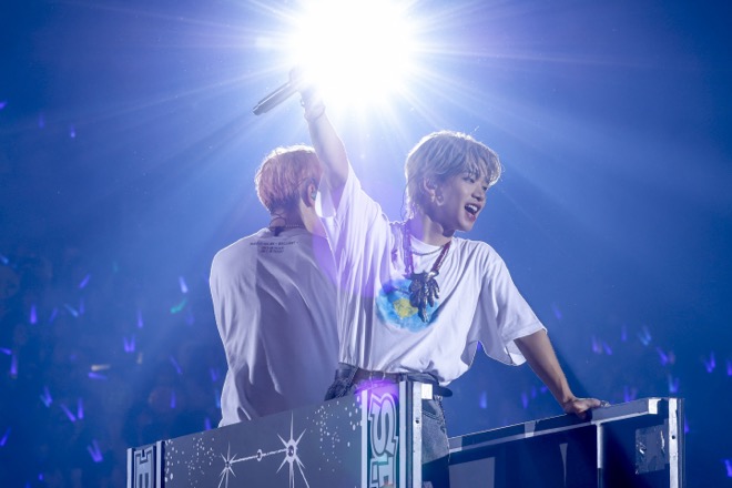 後のMCでFUMINORIが「僕たちとバディを繋げる曲になってます」と解説した「BUD」からは、カジュアルな衣装に着替えてトロッコに乗り込み、場内を周回。《GoGoバディGO》というフレーズに合わせて、タオルとペンライトを回して盛り上がったあと、FUMINORIと合流したMORRIEが喜びのあまりにFUMINORIのほっぺにキスをお見舞い。続く、「ALRIGHT」では、クラップを鳴らし、観客全員でジャンプする中で、トロッコからハンドスモークが勢いよく噴射され、あちらこちらで大騒ぎとなった。