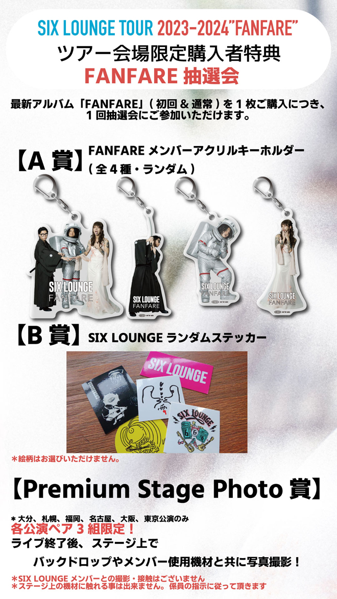 彼らSIX LOUNGEは今週より、最新アルバム『FANFARE』を引っ提げた全国ツアー<SIX LOUNGE TOUR 2023-2024”FANFARE”>をスタートさせる。10月22日、地元の大分T.O.P.S BittsHALLを皮切りに、全国22箇所を周るツアー会場内限定の『FANFARE』購入者特典も発表された。ツアー会場内で最新アルバム『FANFARE』を購入すると、ツアー会場限定「FANFARE抽選会」に参加できる。A賞は「FANFAREメンバーアクリルキーホルダー(全4種)」、B賞は「SIX LOUNGEバンドステッカー(ランダム)」。さらに、大分・札幌・福岡・名古屋・大阪・東京の6公演限定で、「Premium Stage Photo賞」が追加され、「Premium Stage Photo」は、ライブ公演後にステージに上がり、ステージ上のバックドロップ、メンバーが使用していた機材と共に写真が撮れるというスペシャルな経験が出来る賞だ。各地の公演ではチケットソールドアウトが多発しているため、チケットは早めに入手しよう。