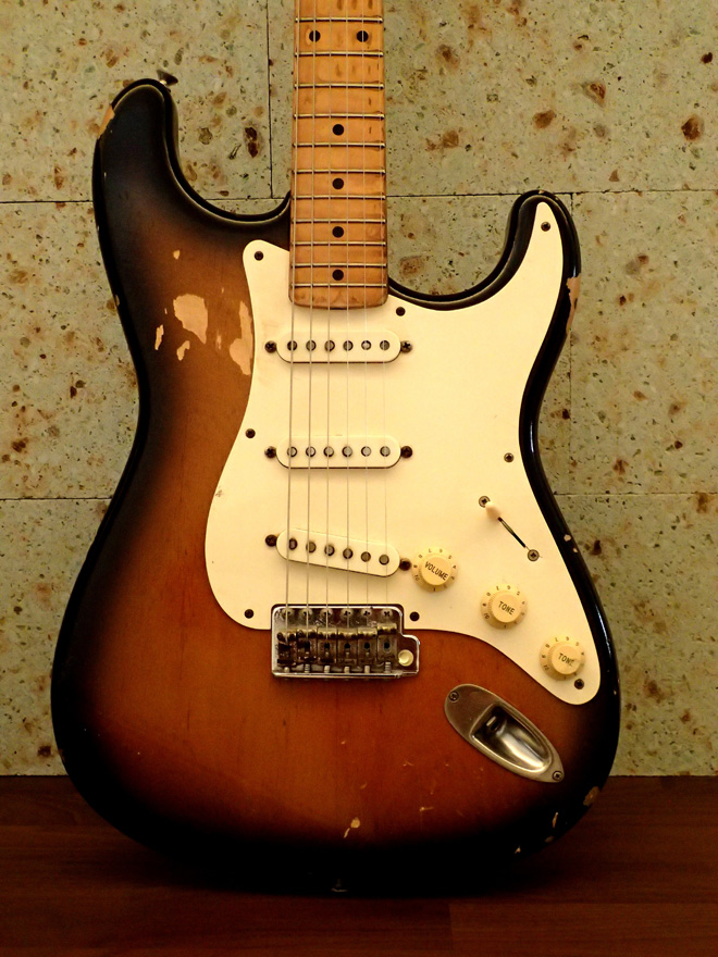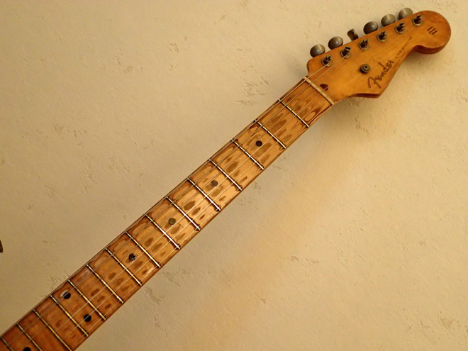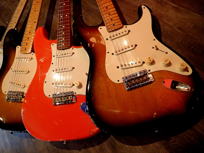 ヘナチョコな自分を変え、とにかくモテたい一心で「いかにも家で練習してるような演奏をする奴はダサい!」と意味不明の信念を持ち、ギターを腕力でねじ伏せるような悪癖奏法を身に着けてしまいました。若く愚かでございました。おかげでフレットの減りが早く、リペアなんか面倒臭いのでほぼ10年ごとにストラトを買い足してきました。キレイに使っていれば売って少しはホクホクできたかもしれないけど、何せばっちいからなあ…
