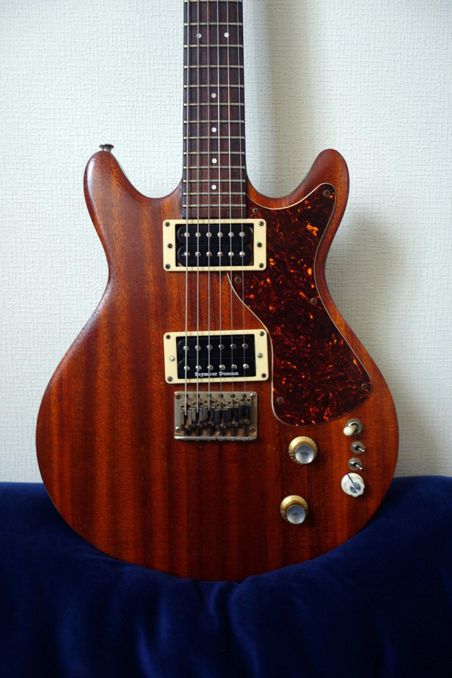 塗装がすごく綺麗。オリジナルよりも高級感がマシマシになっているじゃないですか。いい音しそうなマホですね。リアPUがちょびっとスラントマウントされているのが目を引くなあと思ってよく見たら、渡欧を剥がした時点でリアキャビティが拡張されてる。それでエスカッションのビスが3箇所で止まっているんですね。ソープバーを付けようとしたのかな。電装系はいろいろ追加されていますけど、このようなソリッドでシンプルなギターこそ、どんな音楽でもカバーできる万能な1本なのかもしれません。SG-RRはジョーン・ジェット的なロックンロールをイメージしたモデルだったと思うんですけど、脱がすとこんなにオ・ト・ナだったんですね。(JMN統括編集長 烏丸)