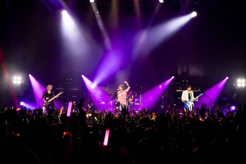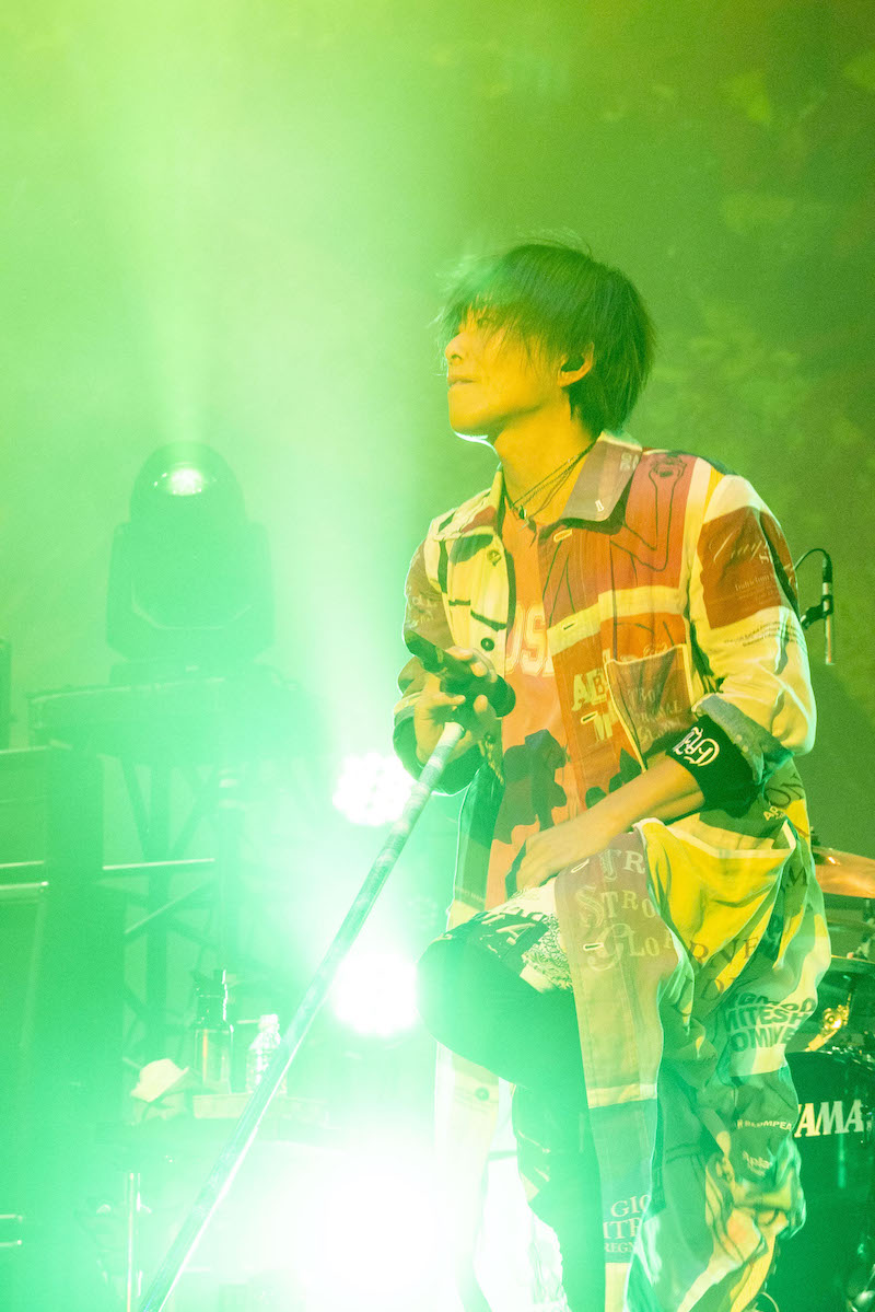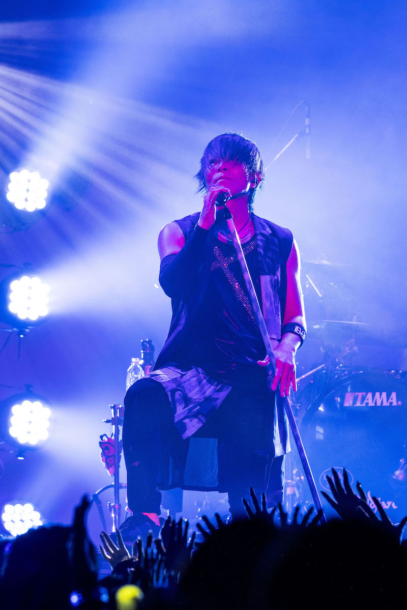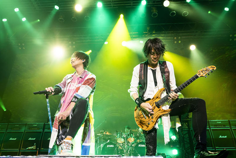 今回のツアーを意識して、ファンとの掛け合いや合いの手をリッチに盛りこんだこの粋な新曲に始まり、オープニングブロックにはコール&レスポンスがたっぷり楽しめる賑やかなナンバーが居並ぶ。KISHOWが客席にマイクを向け、手を振り上げて叫び、e-ZUKAがギターのネックを客席に突き出して煽るたびに、オーディエンスが突き上げる拳とジャンプもどんどん激しく、高くなる。今日は、そしてこのツアーは、俺たちに負けずにお前らも声出して、全身全霊思い切り騒ぐんだぜ!というメッセージが、彼らが選んだ楽曲によって、雄弁に語られていた。