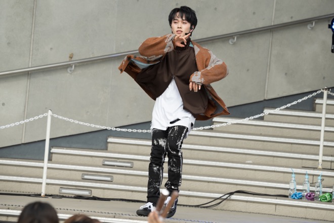 そして11時。超特急のライブではおなじみの発車ベルが鳴り、最新アルバムのリード曲で超特急の最新の“COOL”を体現した「MORA MORA」からライブはスタート。屋外の曇天の下、普段のアリーナ級ライブに比べると、格段に間近で目撃できるパフォーマンスはしなやかで、細かいキメやダンスのシンクロ具合がよくわかる。