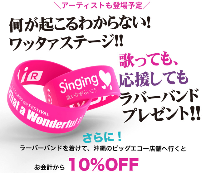 なお、この「ワッタァステージ」には、最新のカラオケ機器LIVE DAM AiRが設置されており、誰でも熱唱できるカラオケステージにもなっている。過去には、氣志團の綾小路翔、BRAHMANのTOSHI-LOW、NAMBA69の難波章浩がやってきたり、ダイスケはんの頸椎椎間板ヘルニアの緊急手術で出演できなくなったはずのマキシマム ザ ホルモンだったが、ナヲちゃんがふらりと飛び入りし「CAN YOU CELEBRATE?」を歌っちゃったりと、とんでもないサプライズ(ハプニング)続出の「BARKS x FM OKINAWA ワッタァステージ」だった。今年も沖縄バイヴスダダ漏れの素晴らしいエピソードがたくさん生まれることだろう。なお「ワッタァステージ」設置を記念し、特製ラバーバンド(なんと沖縄ビッグエコー対象店舗で10%オフの特典付き)の配布も予定されているのでこちらもお見逃しなく。