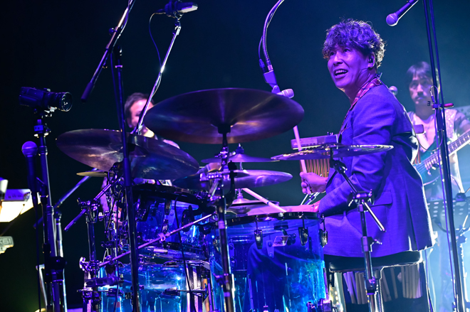 突如、怪しげなSEが流れると場内が暗転。再びステージに明かりが灯ると、メンバーはアフロにサングラスと70s DISCOスタイルで登場。中でもKO-ICHIROはミラーボール型のヘルメットを被り、一際存在感を放っており、フロアからは驚きの歓声が。そんな中で始まった、通称「aho-aho Medley」では、往年のDISCOナンバーをカバーメドレーにて披露し、会場はさながらダンスホールの様相を呈した。