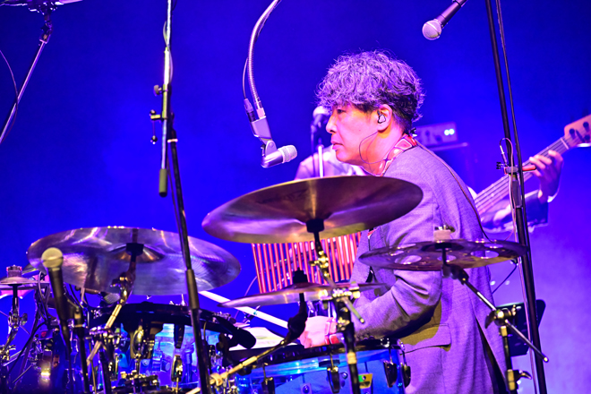 昨年リリースのアルバムより「SUPER SHINING」「GOOD TIME」を披露し、新旧織り交ぜたセットリストに場内は更なる盛り上がりを見せ、DISCOアレンジされた「Hooray Hooray」では両手を天に掲げたオーディエンスが顔を上気させるほど、フロアは熱狂の渦に飲み込まれていった。TAKEの紹介により本公演でコーラスを務めるウルトラ寿司ファイヤーのJぺい、しょーりんがセンターに立ち、彼らの代表曲「全てはエンターテインメント」を披露。サビのフレーズで客席とコール&レスポンスをし、場内はハッピーなムードに包まれた。