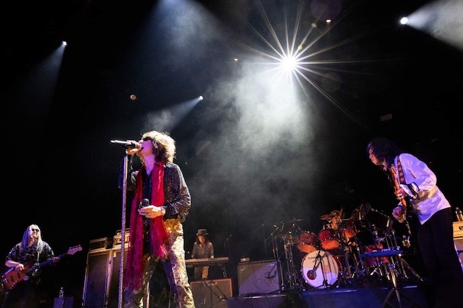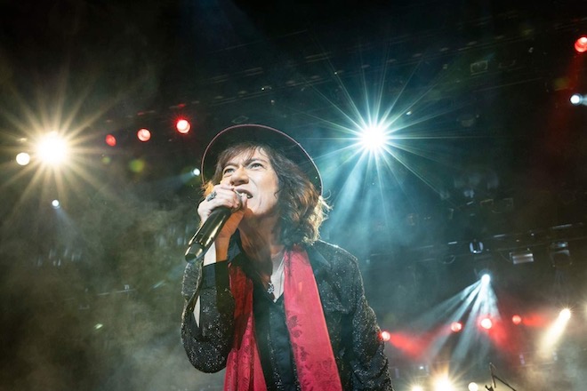 RED WARRIORSがライブパフォーマンスをおこなうのは、およそ1年8か月振り、中野サンプラザでのデビュー35周年記念ライブ以来のことだ。午後6時半、久々の再会を待ちわびるオーディエンスが大歓声と拍手で迎える中、ギターを腰だめに構えた木暮“shake”武彦の右手が一閃、パーティーの始まりを告げる「Casino Drive」のイントロが高らかに鳴り響く。黒いコートに真っ赤なロングスカーフのダイアモンド☆ユカイがステージに踊り込み、マイクスタンドを蹴り上げる。シルバーグレーのロングヘアーをなびかせて、小川清史がぶっとい低音を叩き出す。そして「FOOLISH GAMBLER」の、オーディエンスを巻き込んだコール&レスポンスへ──。そうだ、そうそう、これだよこれ。まばゆい光と爆音と興奮の中で、音楽は一瞬で時を超える、これがRED WARRIORSのロックンロール・マジック。