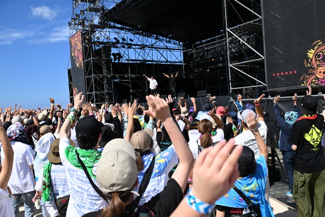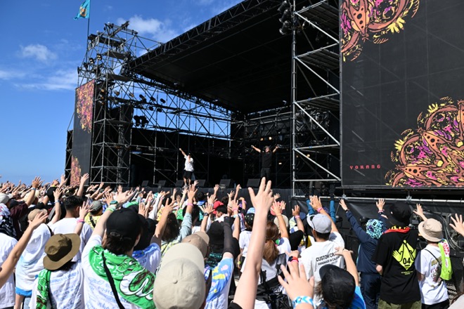 観客がステージの2人に大きな拍手を贈る中、トロピカルなイントロに導かれたのは、レゲエナンバー「ハイビスカス」。心地いい、ゆったりとしたリズムに体を揺らしながら、観客全員がワイプで応えると、「みなさん、楽しむ準備はでてきていますか? ここは沖縄です。最後のサビは全員、両手を上げてカチャーシー、行きましょう!」とYUがウィットをきかせ、そこにいる全員が両手をヒラヒラとカチャーシーを踊るという沖縄開催のフェスならではの景色を作り出す。
