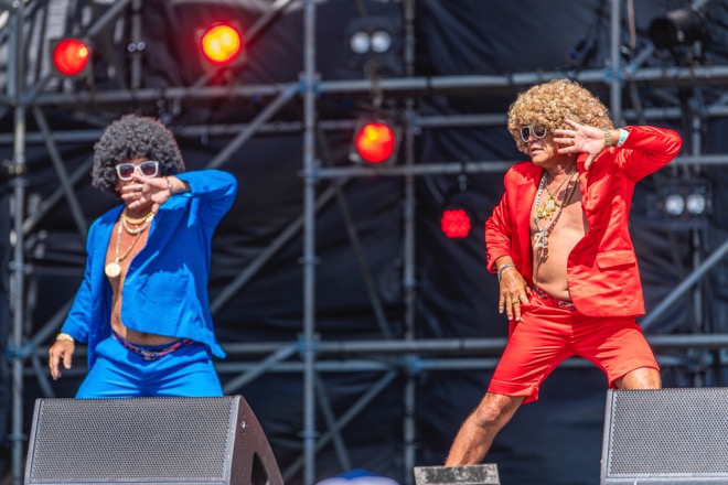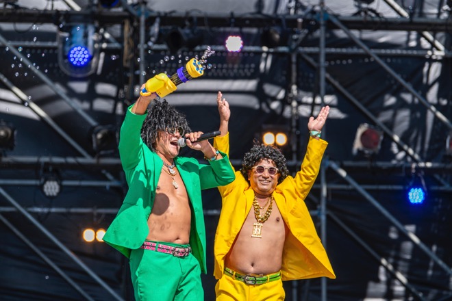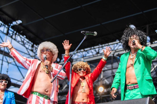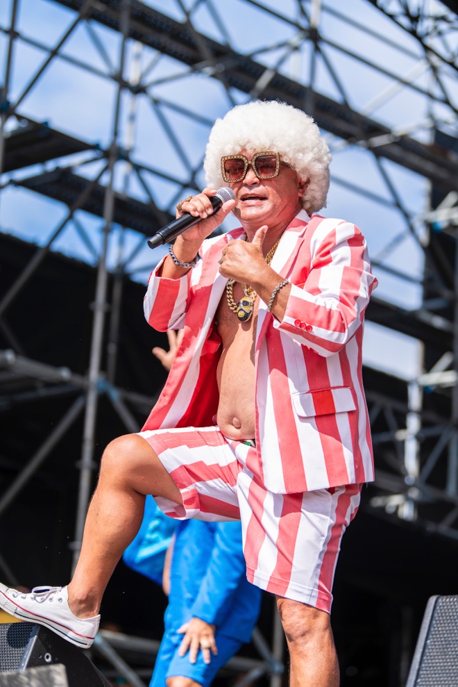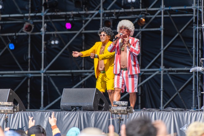 そんな彼らは、’80sのディスコビートや’90sのユーロビートに乗って、歌い踊る。ビーチに集まったORANGE RANGE(ハブSTAGEのトップ)のファンも釣られて踊り出す。さすが、地元に根付いた百戦錬磨のライブグループだ。