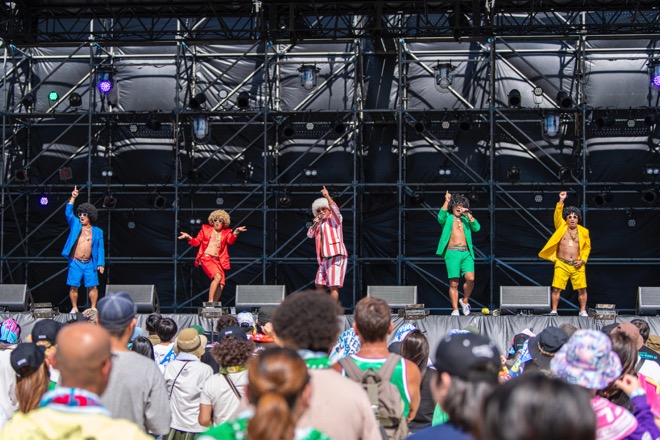 SEと共に挨拶を決めながら姿を現わしたのはメインボーカルのオオミネとイメージカラーはグリーンのジミー。二人はシャボン玉マシンを手に、早くもハッピーモード全開だ。そんな二人のバックを固めるのは、イメージカラーはイエローのコージ、イメージカラーはブルーのカズボー、イメージカラーはレッドのリキオというダンサー3名。