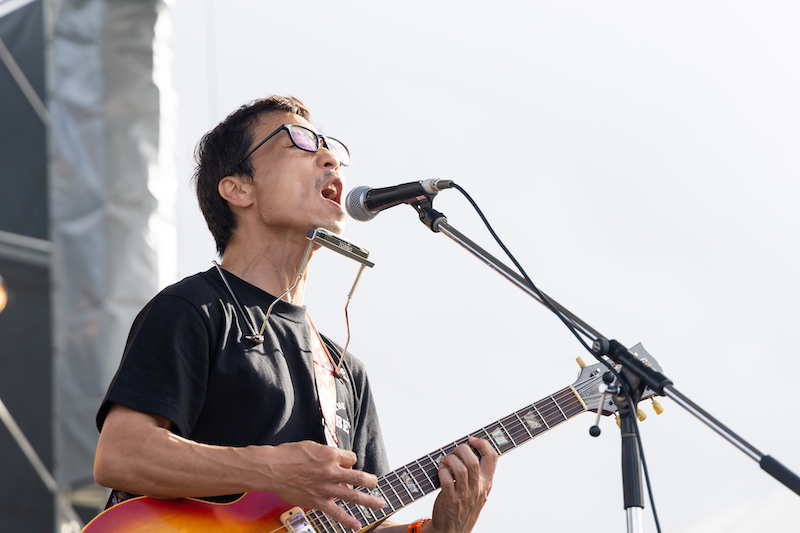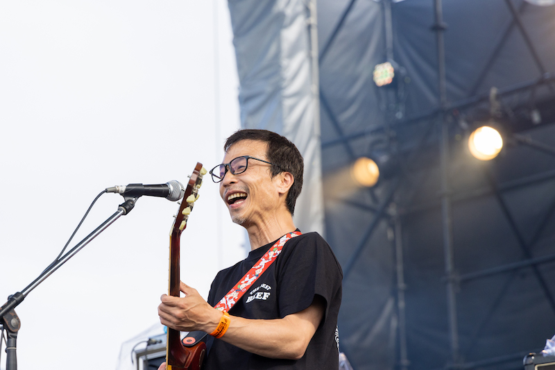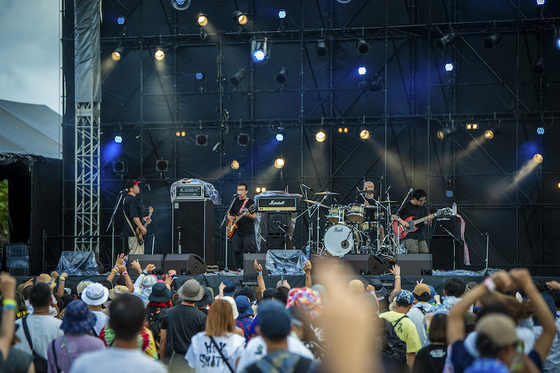 噛みしめるように言葉を重ね、そして次に披露したのは「欠けボタンの浜」。優しい歌が広がる中、さっきまで雲で遮られていた太陽の光もマングースSTAGEに降り注がれていく。さらに“沖縄に新しい風を”と「新利の風」を聴かせ、ラストに待ち構えていたのは名曲「WALK」だ。オーディエンス全員が聴きたかった、体感したかったHUSKING BEEの曲だろう。ストレートなリリックではないが、前向きな姿勢や考え方を綴った歌詞。それに勇気づけられ、共に口ずさみながら曲を自分に染みわたらせていくオーディエンス。HUSKING BEEは、この沖縄で恵みの雨を降らせた。