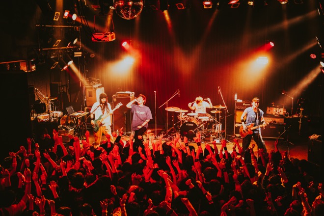 「九州ツアー回ってきました! AFJBの時のフロア、めちゃめちゃ楽しそうやった。一緒に来てよかった。AFJBに大きな拍手を」。後輩バンドへの敬意に会場から拍手が湧く。「あたたかく迎えてくれてありがとう。ラストまでもっともっと盛り上げてもらって、ずっと離れないところまで持っていってもらえたらうれしいです! 今日一番の声、最高の歌声聞かせてくれますか!」