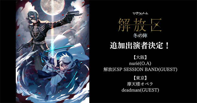 また、出演声優とコラボアーティストが集結し、ライブステージで『マガツノート』世界観を創り上げる大型ライブ<解放区-冬の陣->に、nurié(O.A)、解放区SP SESSION BAND(GUEST)、摩天楼オペラ、deadman(GUEST)の4組の追加出演が決定した。