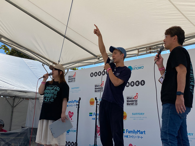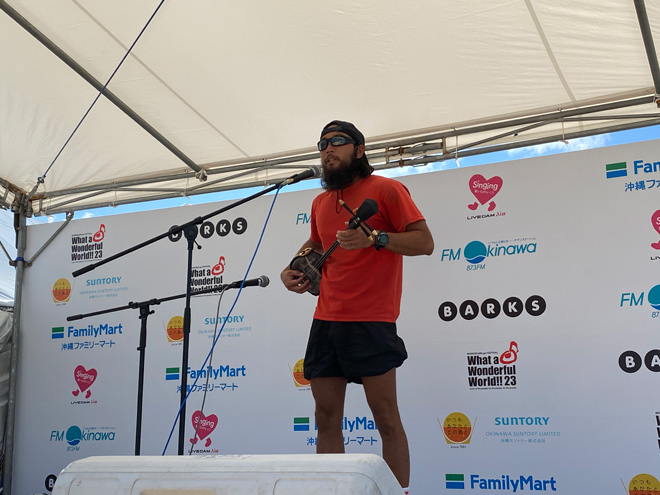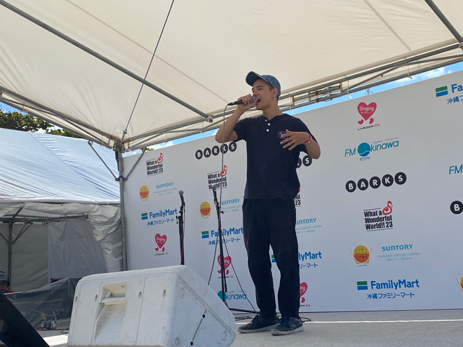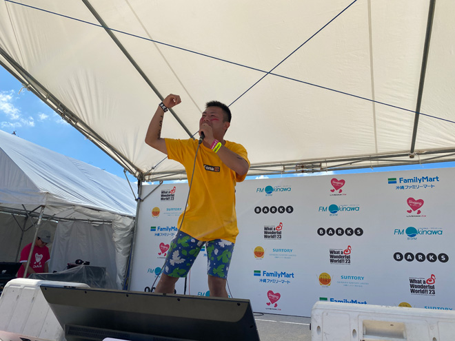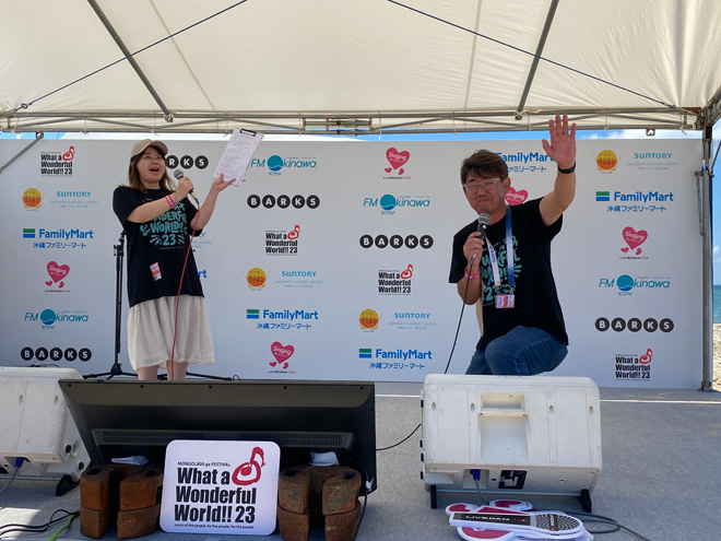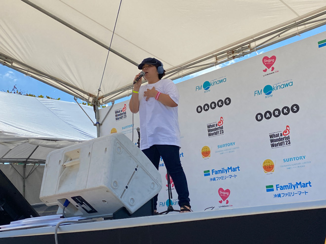 これ以上はないという極上の晴天のもと、12時に「BARKS x FM OKINAWA ワッタァステージ」もカラオケ大会がスタートとなった。<WWW!!23>二日目となるワッタァステージをナビゲートするのは、FM沖縄のパーソナリティ西向幸三と伊是名優子のおふたり。そしてそこに絡むのは、<WWW!!23>に遊びに来たミュージックラバーの人々だ。