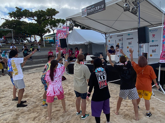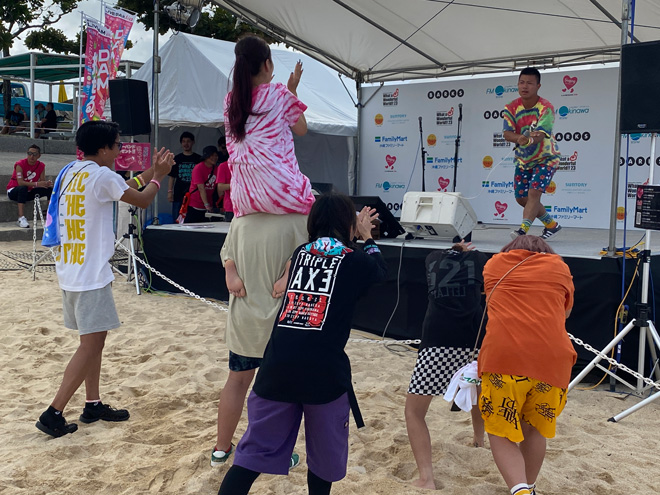 本日ステージを進行してくれるMCは、FM沖縄のパーソナリティ伊藝梓とタイシロウのおふたり。そしてステージがスタートすると同時に壇上に上がってくれたのは普段は海岸のライフガードを行なっているという猛者。二日目にもやってきてくれたものの曲途中でD-51のステージが始まり大ヒット曲「NO MORE CRY」の大音量にかき消されるという、残念ながらもおいしい展開となってしまっていた。今日はそのリベンジでの再登場というわけだ。