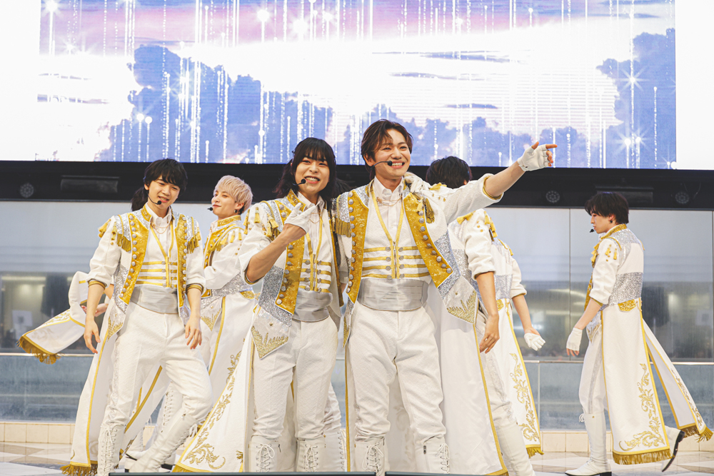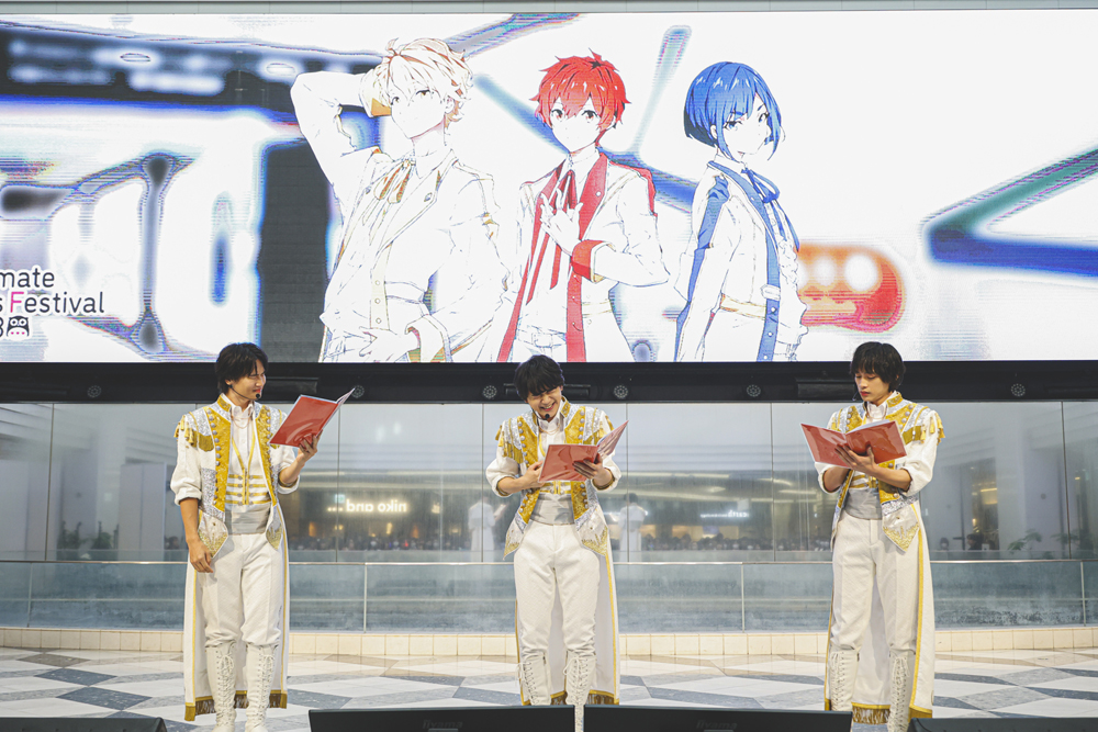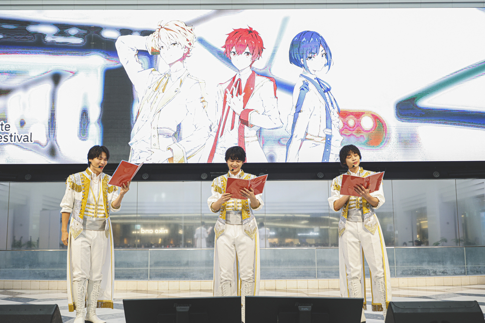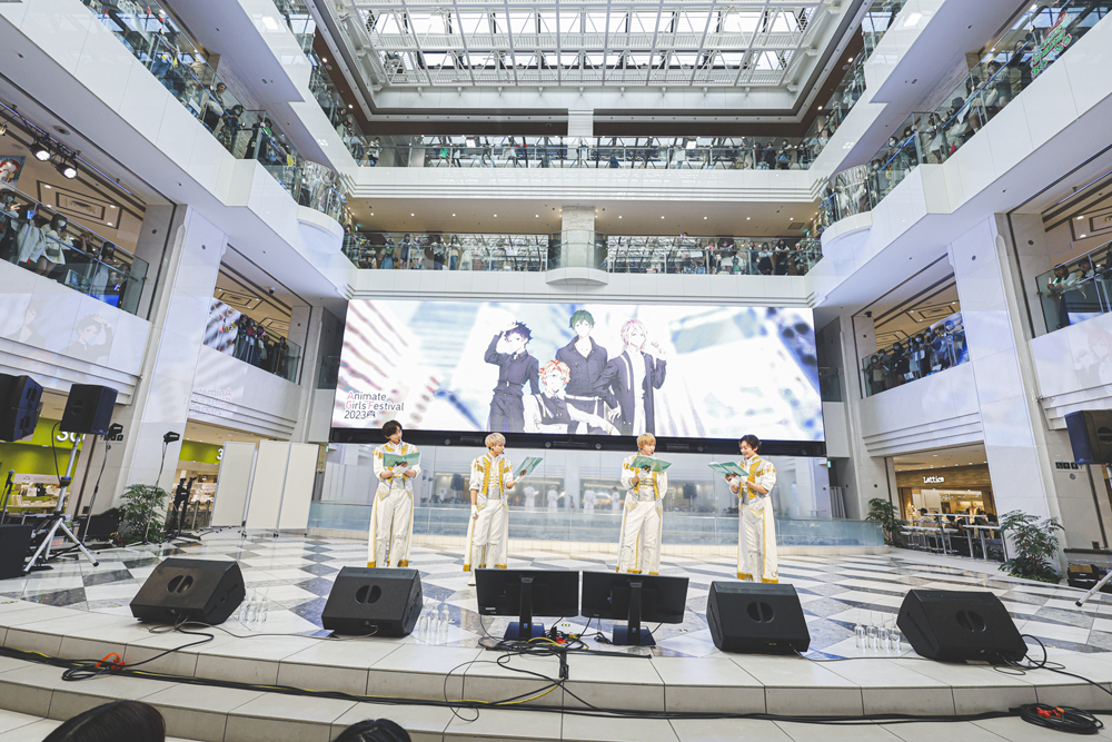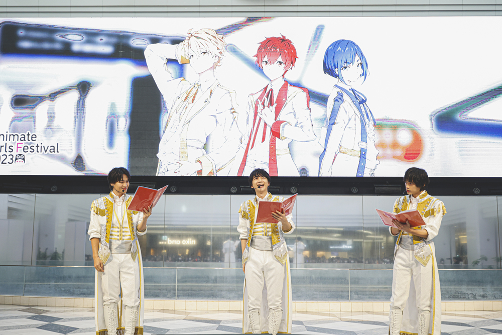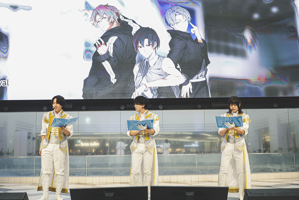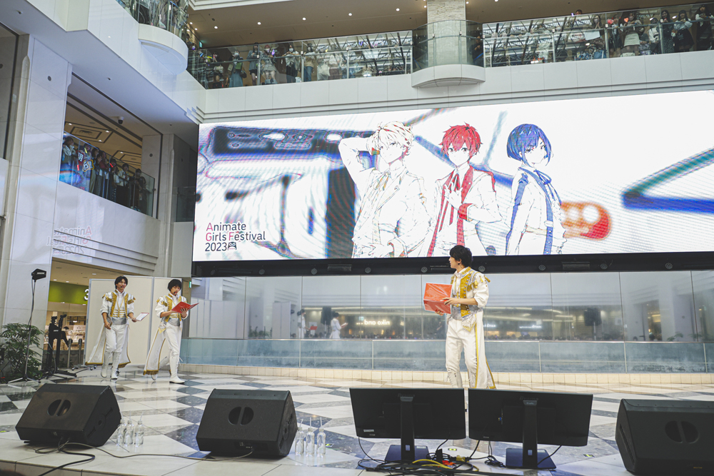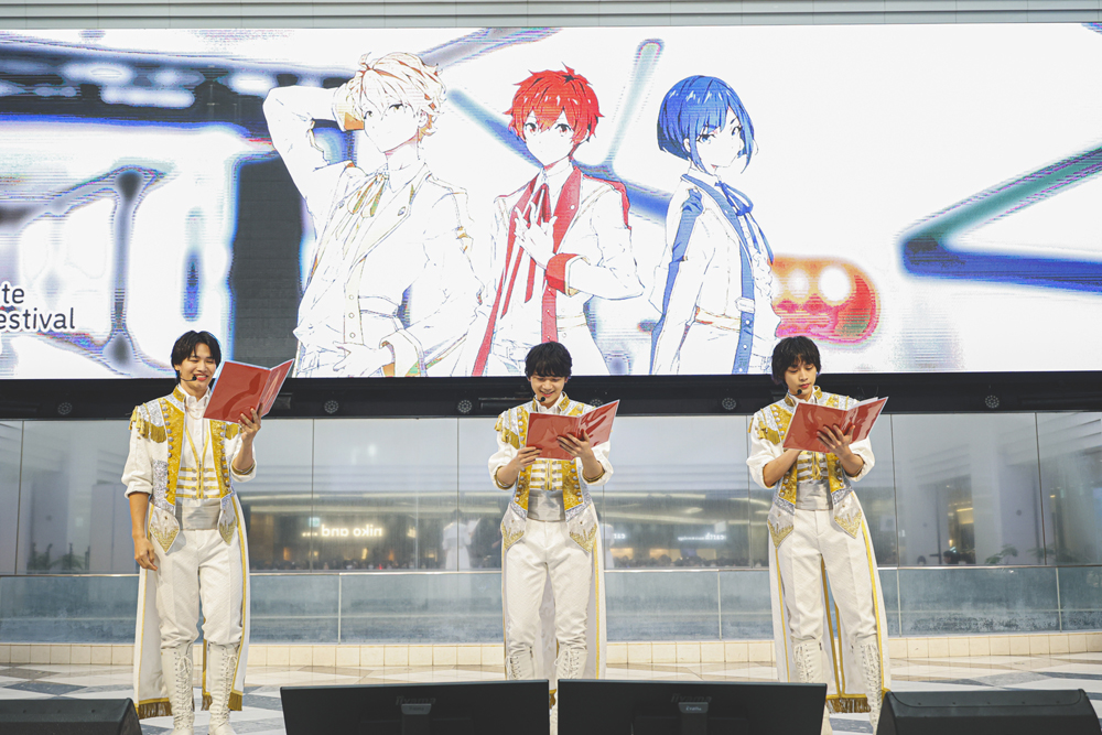 吹き抜けの広場は、4フロアすべてが多くのファンで賑わう。オープニングムービーが流れた後は、まずPROTOSTARの清瀬明良役・戸谷菊之介、直江万里役・山口諒太郎、五十鈴川千紘役・平井亜門が赤い表紙の台本を手にステージへと駆け込んできた。アニメのキャラクターがレッスンの後にサンシャインシティに遊びに来たという設定の朗読劇で、仲睦まじい会話が広がる。朗読劇とはいえど、静止してただ台詞を読むだけではなく、実際に身振りなどを交えて3人で会話をするように繰り広げられるため、その様子はアフレコにも、3人が役柄を演じているようにも、実際にキャラクターがサンシャインシティに赴いたようにも見える。冒頭から“多次元アイドルプロジェクト”の醍醐味を発揮した。