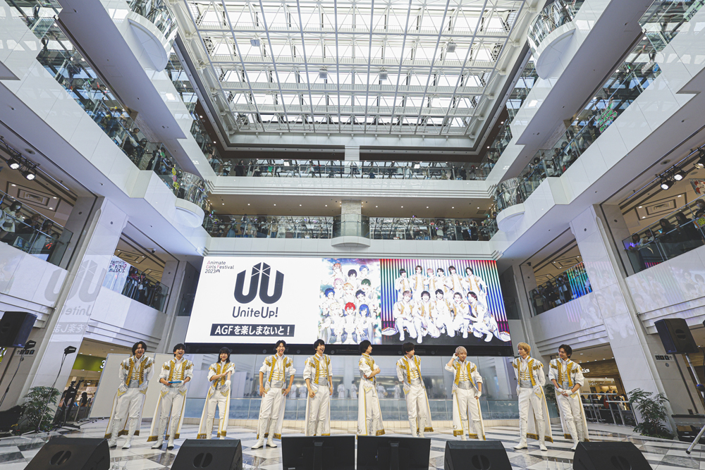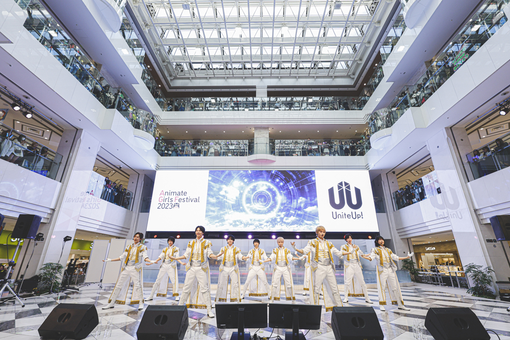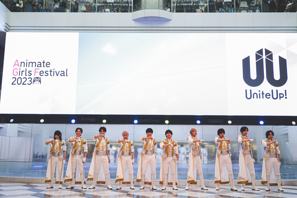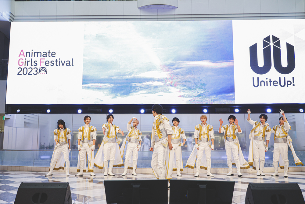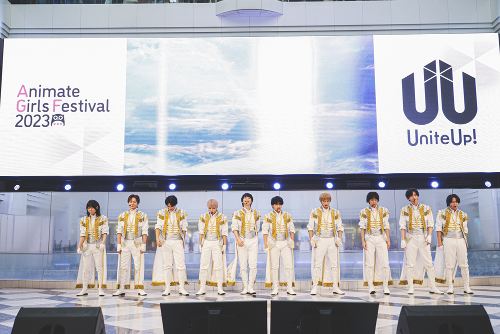 ソニーミュージックが贈る多次元アイドルプロジェクト“UniteUp!”。彼らが11月4日、<アニメイトガールズフェスティバル2023>(通称:AGF2023)の池袋・サンシャインシティ アルパB1の噴水広場に設置された出展ステージに登場し、初の朗読劇をはじめ、楽曲歌唱やトークなど40分のパフォーマンスを披露した。
