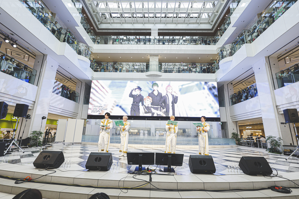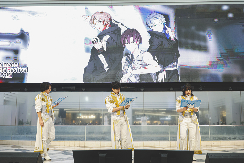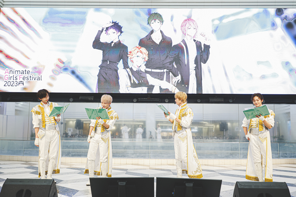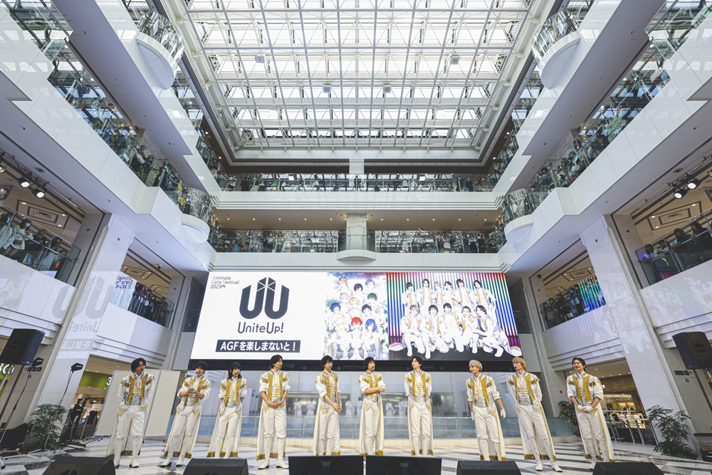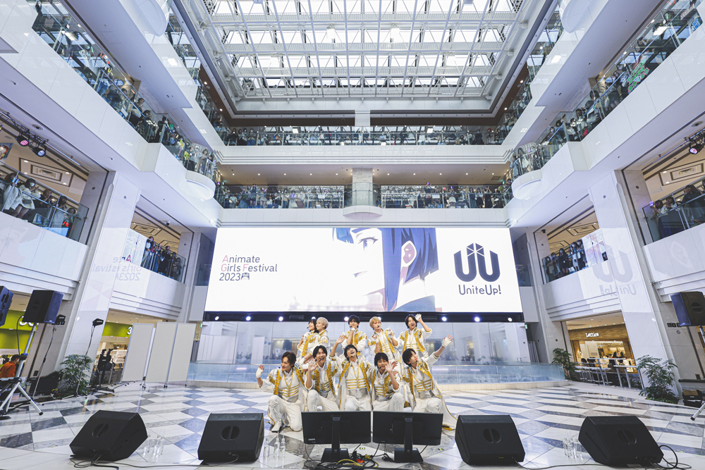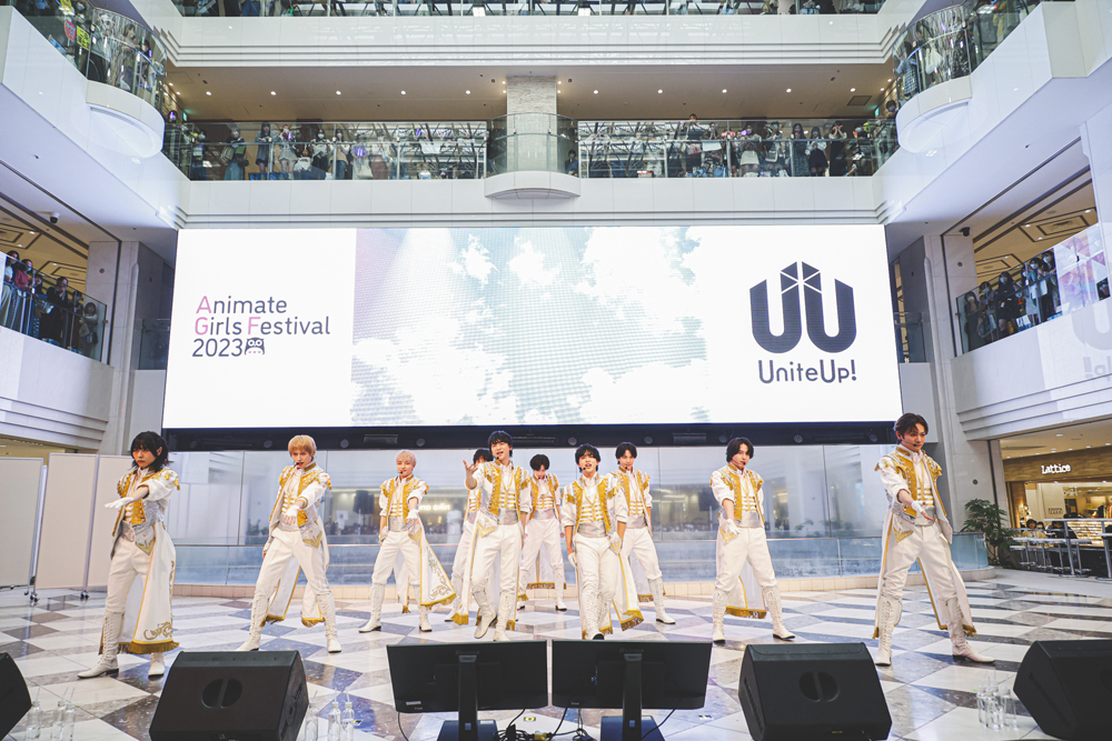 ソニーミュージックが贈る多次元アイドルプロジェクト“UniteUp!”。彼らが11月4日、<アニメイトガールズフェスティバル2023>(通称:AGF2023)の池袋・サンシャインシティ アルパB1の噴水広場に設置された出展ステージに登場し、初の朗読劇をはじめ、楽曲歌唱やトークなど40分のパフォーマンスを披露した。