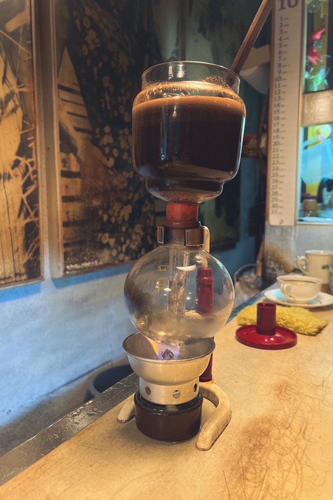 「サイフォンなんですね」と声をかけると、「最近はもうサイフォンでやってるお店も少ないでしょう。男の子はこういうの見るの好きよね〜」とママさん。実験みたいですね、と僕。
