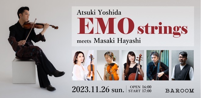 吉田篤貴EMO stringsとしては初登場となる南青山BAROOMでの演奏を楽しんでいただきたい。