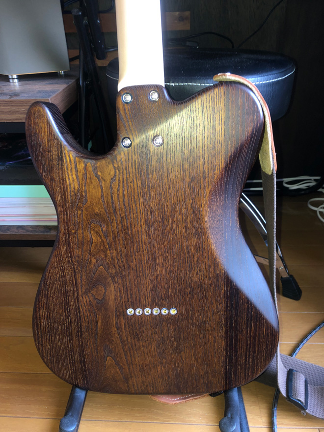 ボディはアッシュ、しかも塗装なしのオイル仕上げ。指板はローズなのでスペックは希望の通り。ピックガードだけ好みの色に変更しました。