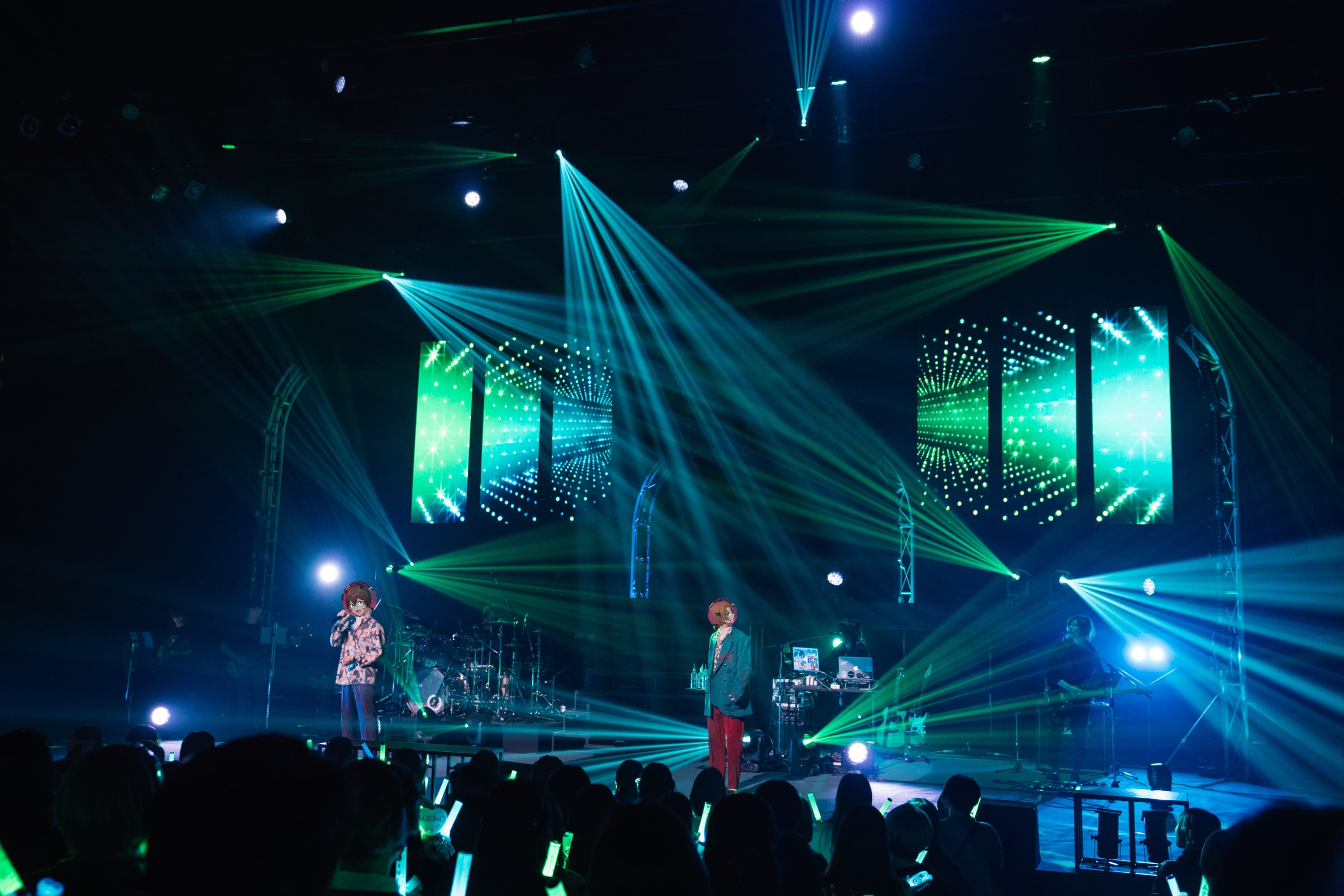 しるばーながステージに残って「CH4NGE」を披露した後は、そのままの状態でステージ上にもるでおを呼ぶ。2人が歌う「イカサマダンス」はどこまでもかっこよかった。そこから、もるでおは「アノニマスファンフアレ」を歌い、前方に飛び出した楽器陣と共にハードな空間を作りあげる。ソロでありながらバンドの雰囲気で一気にノリ良くライブの流れを変えていくあたり、魅せ方を分かっている。そして、ステージ袖からゆっくりと現れたのは、まるぐりだ。抑揚の効かせた声量で「コールボーイ」を歌い終わると、無音と一緒に「シニカルナイトプラン」を。2人が響かせた極上のハーモニーは誰もが聞き入ってしまうほど完璧だった。そのまま無音だけがステージに残って疾走感のある「アイデンティティ」を披露し、本編中盤は終わっていった。