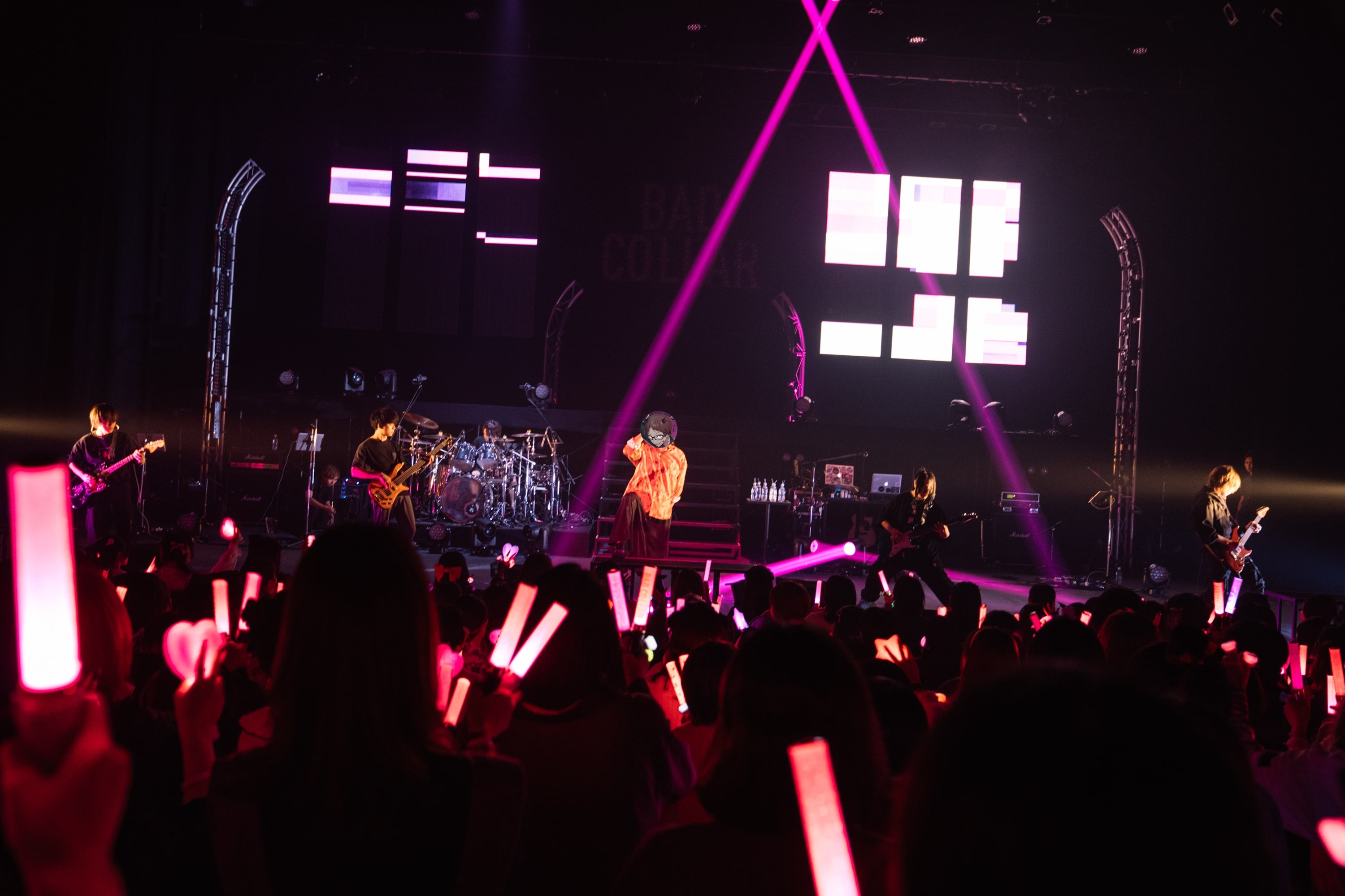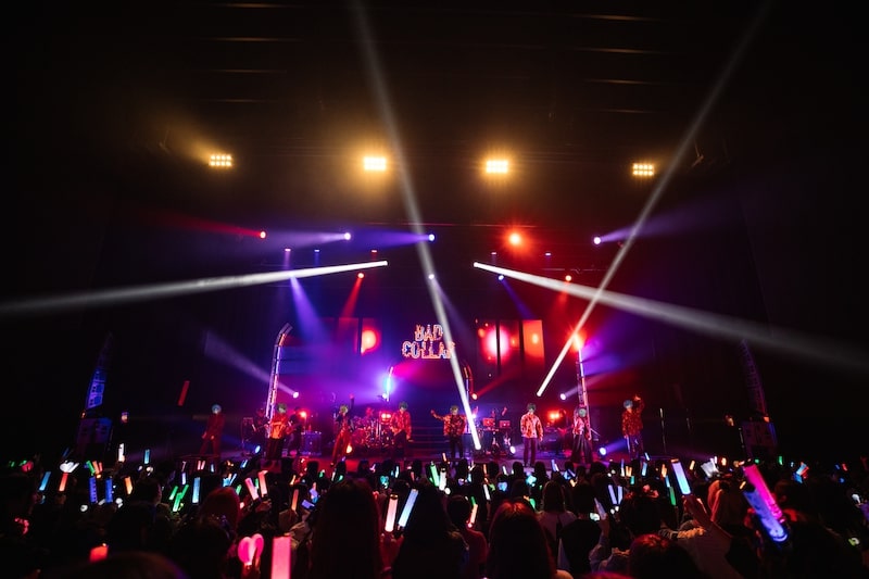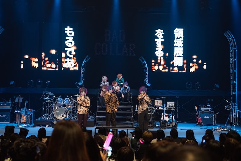 ステージ後方には“BAD COLLAR”の文字がギラギラと輝き、ハロウィンらしくカボチャのイラストも映し出される。セットの2階部分で歌うのは、ゆとり、無音、もるでお、ムチャ。1階部分には、しるばーな、まるぐり、しゃけみー、スタンガンが着く。バンドメンバーの勢い溢れる生演奏もさることながら、歌い手8人が揃ったステージは圧巻ともいえる光景であり、それぞれの歌声が混ざった瞬間、客席は思わず感嘆の溜息を漏らした。