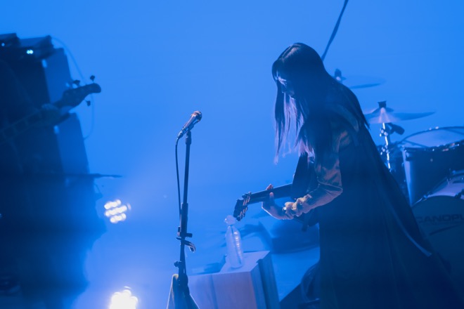 開演時間ちょうど、SEが会場に鳴り響くと大きな手拍子に迎えられて、笑顔のハナフサマユがステージに姿を現した。バンド編成はギター、ベース、ドラム、キーボード、バイオリンというフルセット。ライブはアルバム『バートレット』収録曲「赤い糸」からライブがスタートした。