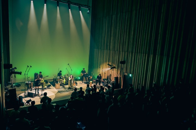 高槻城公園芸術文化劇場 太陽ファルマテックホールは大阪府高槻市に今春に完成したばかり。同ホールとしては、ハナフサマユの今公演が初めてドラムセットを入れたバンドサウンドを響かせる“バンドサウンドこけら落とし公演”になったという。