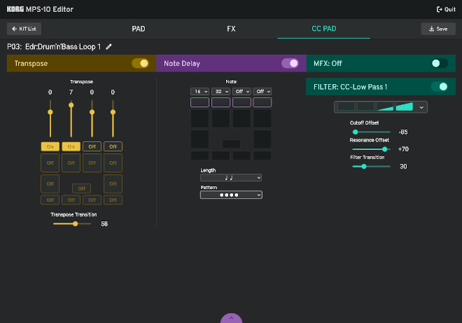 「MPS-10」の上部に位置する細長い4個のパッドはCC(コンティニュエンス・コントロール)パッドとして使用可能。打撃位置を128段階で検出し、エフェクト・パラメーターを直感的にコントロール。緩やかなフィルタリング、ノート・ディレイによるEDM風のドラム・ロール、多彩なMFX機能によるリアルタイムの音色変換も瞬時に可能。