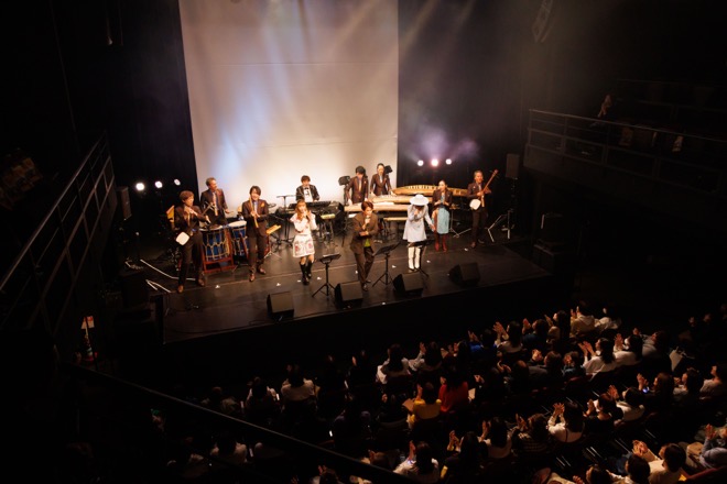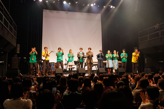 このイベントは、“きのこの山たけのこの里 presents”と銘打たれており、鳴り止まぬアンコールに再登場した出演者は全員、「きのこの山」か「たけのこの里」のTシャツをそれぞれ選んで着用していた。“きのこ派”か“たけのこ派”かの談義を繰り広げ盛り上がった後、「万殊の灯りに想いを馳せて」を演奏。曲の終わりに観客も一緒に“三本締め”、最後にもう一度“一本締め”を行ない、大盛況のうちに幕を閉じた。