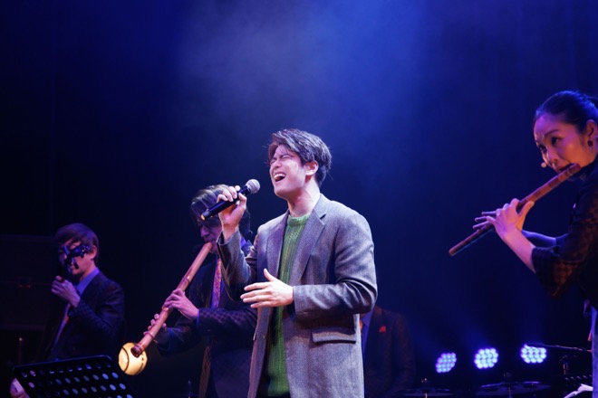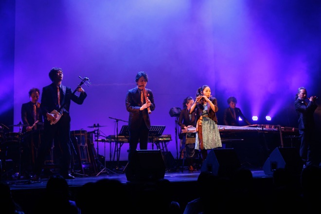 AUN J クラシック・オーケストラのメンバーがステージに登場し、厳かに「大河の想い」を奏で始めると、その独特の世界観に、客席が一気に惹き込まれるのが分かった。さらに次に演奏された「青い薔薇」で、観客はさらなる深みに誘われてゆく。「皆様、ようこそお越しくださいました。私たちAUN J クラシック・オーケストラは、和楽器のみで編成された7人組のユニットです。今回は『NEXT ASIA FESTIVAL』ということで、なぜ“NEXT”を付けているかと言いますと、私たちは『ONE ASIA  ジョイントコンサート』を続けています。これまで7年間かけてASEAN10カ国をすべて回らせていただいた。“その次”のためです」と、MC担当の石垣征山(尺八)があいさつ。そして、伝統的な和楽器の音色を斬新な曲調アレンジで聴かせる「乱」と、新曲の「この花咲夜姫」を披露した。
