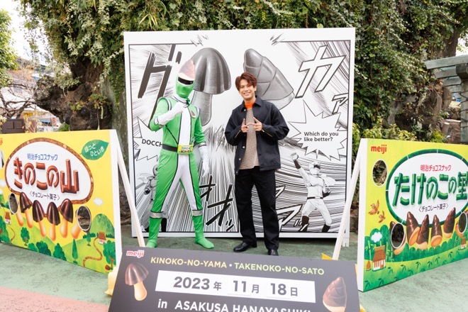 なお、この日、花劇場と隣接する花やしきは、「きのこの山」と「たけのこの里」にジャックされており、「きのこ、たけのこDOCCHI派?」を海外の人々にも問うイベントを開催中。花やしきのスタッフも<NEXT ASIA FESTIVAL>のスタッフも全員が、それぞれ好きな派のTシャツを着用して業務を行なっていた。森崎ウィンは開演前、花やしき内に設置された「きのたけグローバル党員証」の発行所を訪ねて、「たけのこ党」の党員証をゲット。フォトスポットでは、写真撮影にも興じていた。