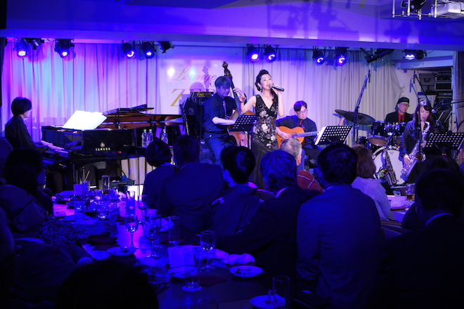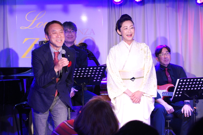 地元・函館を舞台に歌った「愛しの函館」で前半を締めると、和装からドレスに早変わり、後半戦はジャズスタンダードの「LOVE」と「Come On A My House」を披露。作曲家杉本眞人が見守る中歌った「紅い花」では感極まって涙する場面も。