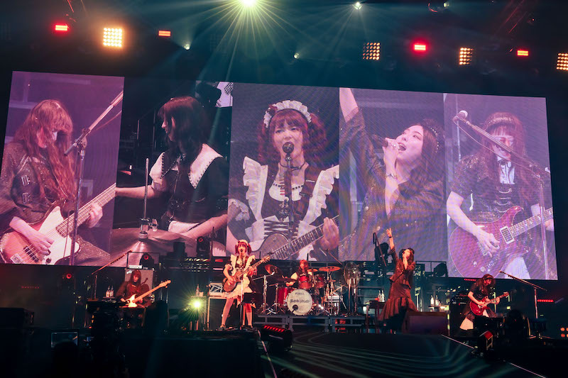 この自己初となる横浜アリーナ公演開催が決まってからというもの、彼女たちの視線の先には常にそれが浮かんでいたはずだし、そこで演奏することを想定しながら楽曲制作に取り組んだり、演出等のアイディアを出し合ったりしてきたことだろう。実際、今年に入ってからのインタビュー記事の多くでは、それに向けての並々ならぬ意気込みを、5人は異口同音に語ってきた。あらかじめそうした記事などに目を通してきた熱心なご主人様お嬢様(=ファン)からすれば、この公演に向けての期待感は時間経過とともに高まりを増していたに違いない。そして彼女たちは、そうしたオーディエンスの期待に応えるのみならず、さまざまなサプライズも提供しながら、バンド自体が過去最強の状態にあることを証明してみせた。