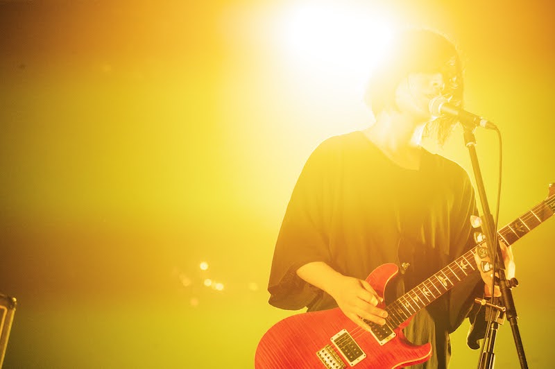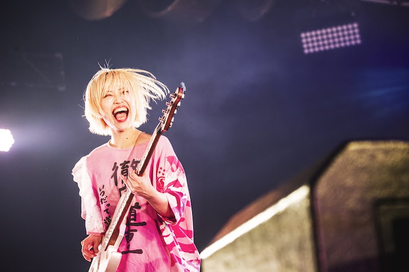 オーディエンスの起こす大きなハンドクラップに迎えられるように金閣ステージに登場したのは、ヤバイTシャツ屋さん。出てきた3人は笑顔全開で、結婚したばかりのしばたありぼぼ(B, Vo)からは幸せオーラも漂ってくる。祝福や歓迎の拍手を受けながら、こやまたくや(Vo, G)が開幕を宣言した。