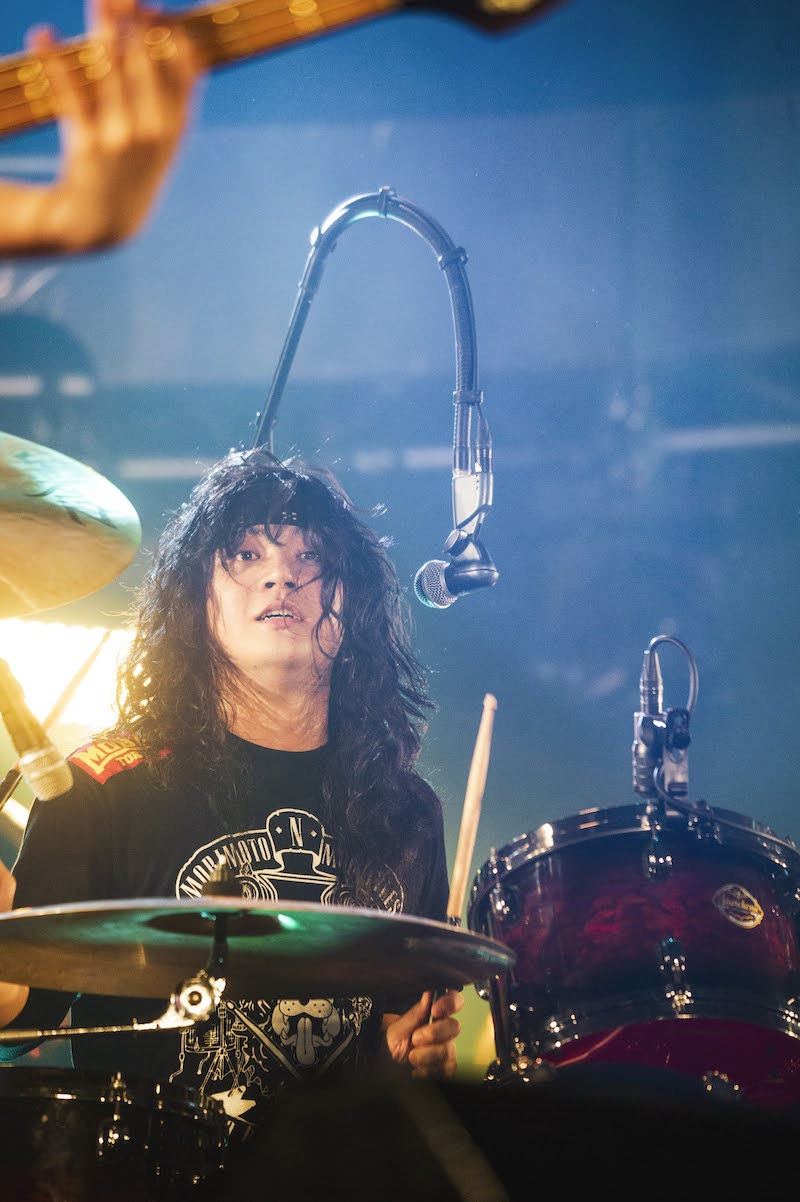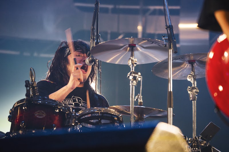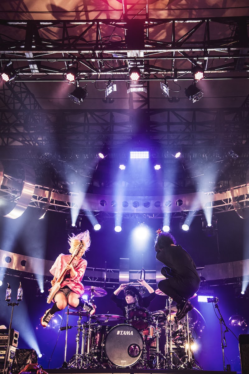 直後、始まった「ヤバみ」から、まさにフロアはヤバみ状態。連発するクラウドサーフとサークルモッシュなど、思いっきり自分自身を解放していくオーディエンスばかり。いや、ステージ上の3人もやはり同じ。金髪を幸せ色に輝かせながら激しくベースを刻むしばたありぼぼ、連獅子の舞いのごとく長髪を振り乱しながらドラムをブッ叩くもりもりもと(Dr)、限界知らずのテンションでリフを刻みながら煽るように歌い続けるこやまたくや。オーディエンスが放ってくる熱量を、全て自分たちのエネルギーに変換しながらバンドサウンドを轟かせるヤバイTシャツ屋さんである。