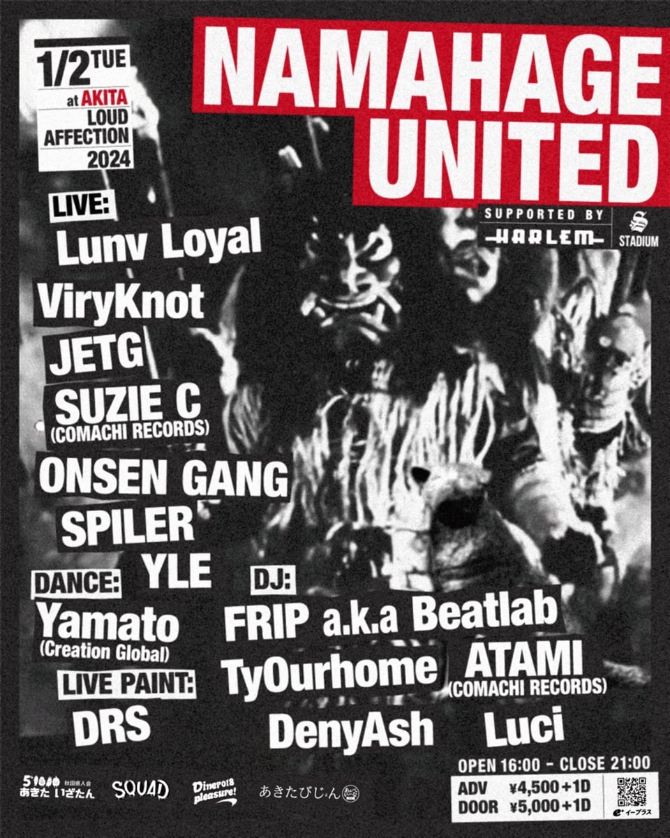 秋田出身アーティストによる音楽イベント<NAMAHAGE UNITED Supported HARLEM & STADIUM>が、2024年1月2日(火)秋田 LOUD AFFECTIONにて開催される。