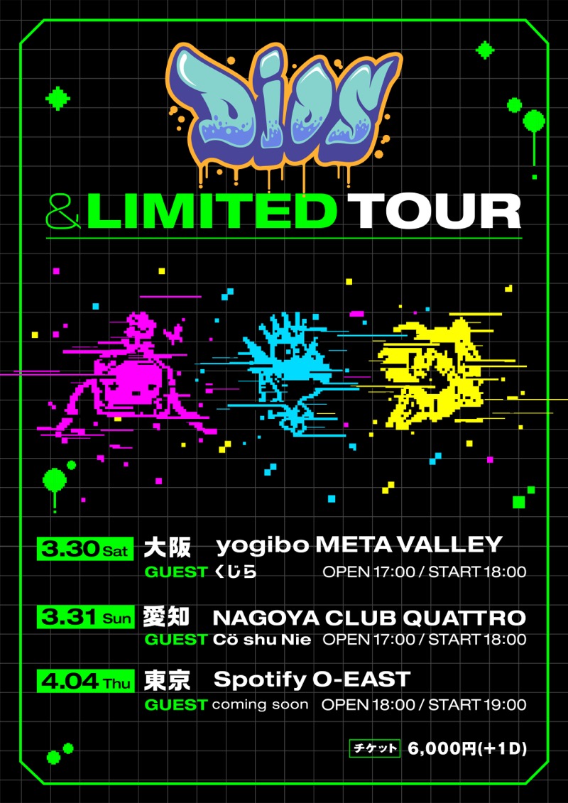東名阪対バンツアー<Dios&LIMITED Tour>は、2024年3月30日の大阪・Yogibo META VALLEY 公演を皮切りに、3月31日に愛知 NAGOYA CLUB QAUTTRO、4月4日に東京 Spotify O-EASTをまわるもの。各地にそれぞれゲストバンドを迎える。