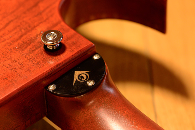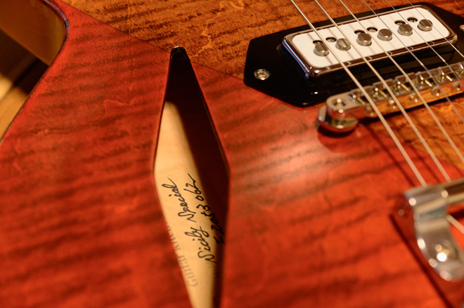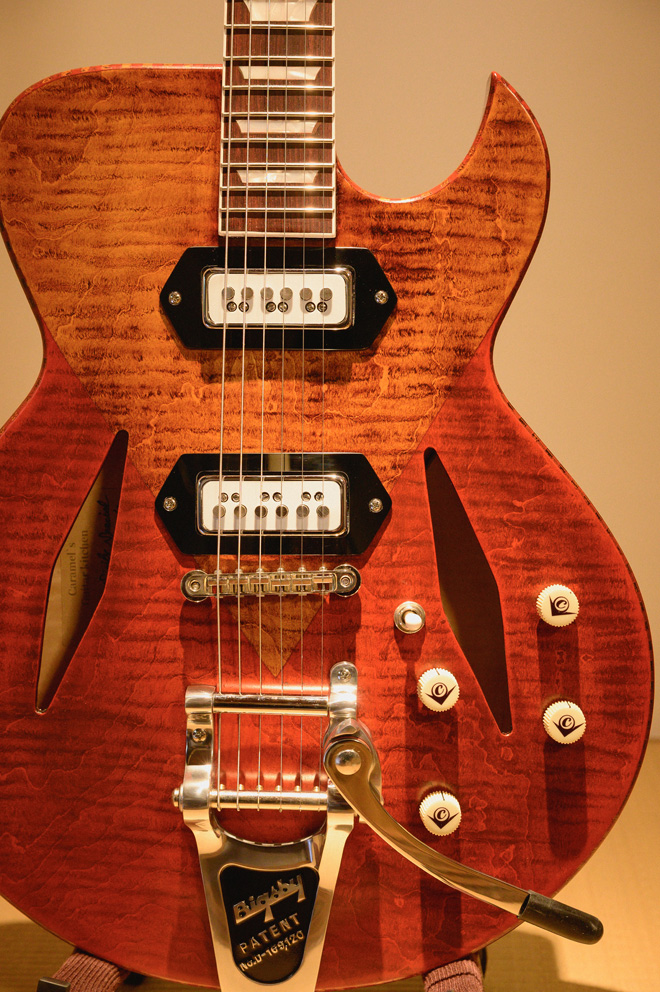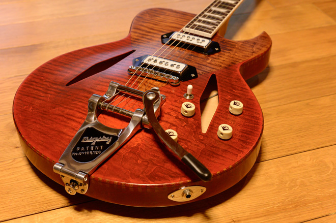 スペックは、マホガニーネックにミディアムスケール・ローズ指板、ボディは独自のセンターブロック構造でマホガニー材とソリッドのメイプル材を組み合わせる事により、適度な甘さとシャープさを兼ね揃えた設計だ。木目を活かすためにボディートップ、サイド、バック、ヘッド突板にはすべてカーリーメイプルが用いられている。ピックアップはTV JONESのT-Armondだ。