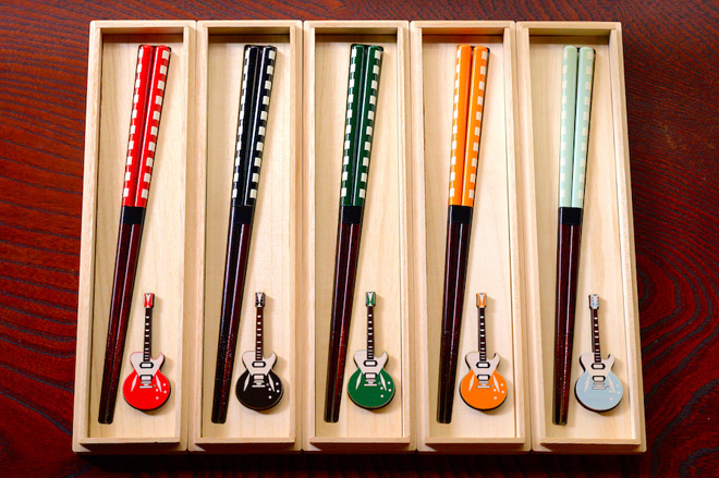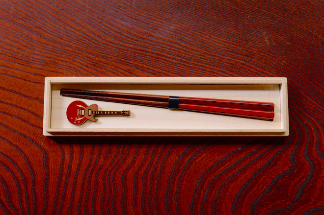販売はTabby’s Guitar&Music限定だが、もれなくこのギター誕生のきっかけとなったラーメンをつかみやすいオリジナル漆箸セットがプレゼントされる。実際にこのギター製作時に出た端材により作られたものという、これもスペシャルな逸品だ。