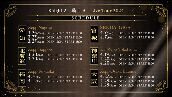 同ツアーは、3月26日(火)のZepp Nagoyaを皮切りに、北海道から福岡まで約1カ月で全国6カ所全15公演をまわる。Knight A – 騎士A -は、2021年に初ライブを東京・豊洲PITを開催して以降、この2年で横浜アリーナ、幕張メッセ、東京ガーデンシアターなどの関東のアリーナ規模の会場を中心に精力的にライブ活動をしてきたが、北海道から九州までの全国5大都市をまわるツアーは今回が初めてだ。