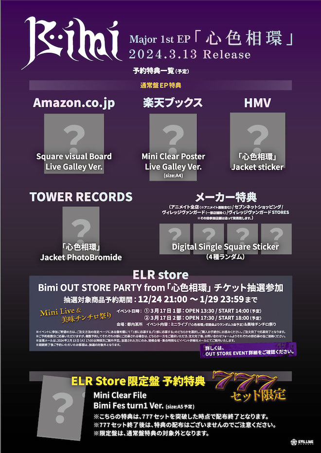 『心色相環』通常盤の予約者を対象とした法人別予約特典、ELR Store限定盤の特典、<Bimi OUT STORE PARTY from「心色相環」>開催も発表されている。