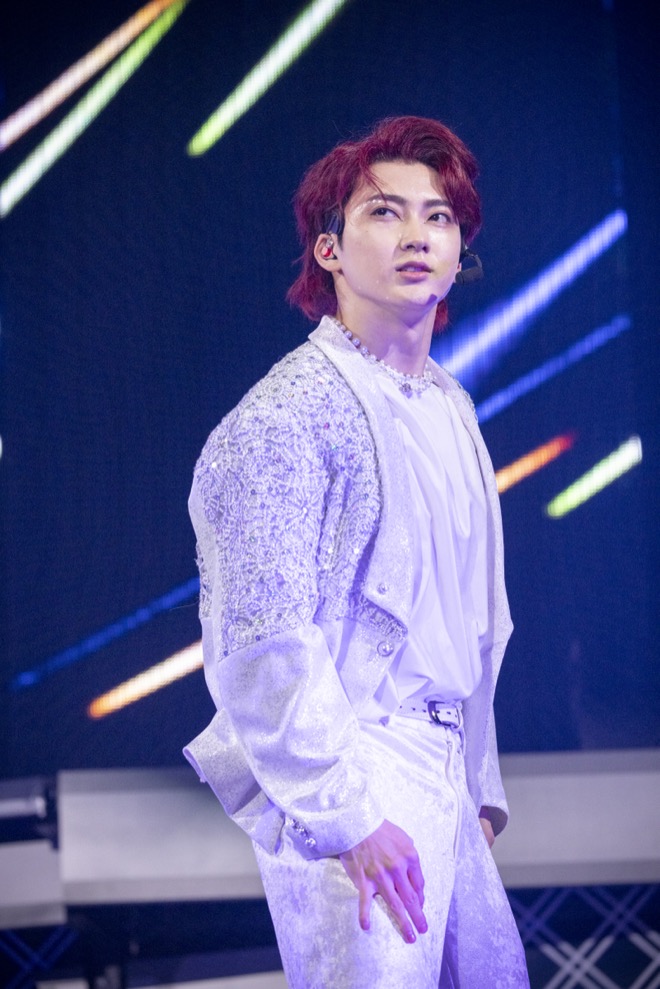 イベントも含めた精力的なライブ活動やプロモーションが功を奏し、着実に知名度を高めてきた2023年の超特急。その成果は今ツアーの全4公演が、立ち見も含めて完全ソールドアウトという形で現れ、トータルで4万6千人もの8号車が集結した。そんな熱気あふれる客席に高揚感あふれるオーバーチュアが流れ、ステージ中央の巨大LEDパネル上で時計の針が0時ちょうどを指すと、パネルが2つに割れた中から、きらびやかな純白のセットアップを着た9人が気合満々で登場。豪快に打ちあがるファイヤーボールに囲まれ、なんと完全未発表の新曲「Countdown」で、ダイナミックに幕開けを告げる。このツアーのために作られた、けれど事前に一切情報解禁されていなかった楽曲のサプライズ披露に熱狂する8号車も、最終日には早くも音に合わせてコール。7人のダンサーそれぞれが順にセンターを取って“今”の超特急をアピールしつつ、アリーナ席に突き出たセンターステージに飛び出し、重厚なダンスビートで壮大かつエッジの利いた最新形の超特急を叩きつけて、“We’re superstars No.1”というリリックにふさわしい風格を漂わせる。