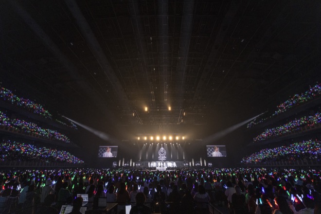 ここでソロパートの先陣を切ったのが、ダンスリーダーでもある5号車のユーキ。黒づくめのバックダンサー6名を従え、自身のセンター曲「Play Back」をサンプリングしたダンストラックで表情豊かに躍動する。時を刻む音に合わせてセンターステージへと進み、8人と合流してからは、これまた9人では初となるエレクトロダンス曲「Time Wave」を披露。後方に控えるボーカル2人がオートチューンの利いた歌声で淡々とリズムを刻み、前方のダンサーが感情を排した無機質な表情とメカニカルな動きで客席のペンライトを揺らすという構図は、まさしく“メインダンサー&バックボーカル”ならではのものだ。それを円形のステージで次々に向きを変えながら展開して、360度の8号車をサイバーな異世界へと誘っていくのだから、まったく目が離せない。