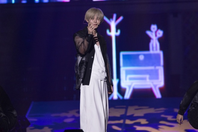 8号車との一体感を高めていくクライマックスで、さらなる熱狂を呼ぶべく、ソロパートのトリを飾ったのは、2013年よりリーダーを務める3号車のリョウガ。スポットライトを浴びてダンスをキメようとしたところで照明が消えたり、マイクがオフになったりとトラブルが続いて、電力不足を解消すべく自転車発電に挑んで感電するというコミカルな小芝居も、陰キャが十八番の彼ならではのものだ。そこから「充電完了!」とスタートしたのは、これまた9人での初披露となる「Believe×Believe」。白目を剥いて感電ダンスを繰り出すエキセントリックなアクションに全員が全力で挑み、さらに「お楽しみはこれからだ!」(リョウガ)と、無敵の鉄板曲「超えてアバンチュール」を投下する。ファイヤーボールや火花がド派手に打ちあがって心身両面の温度を上げるなか、変顔を炸裂させたり全力でジャンプしたりと、それまで提示してきた隙のない“Cool & Stylish”をブチ壊すカオティックなパフォーマンスもまた、超特急の確たるアイデンティティ。「頭、取れるまで振れ!」というリョウガの煽りに応え、ペンライトごとヘッドバンギングする8号車に9人のテンションも爆上がり、ボーカル組の歌も半ばシャウトに。だが最大のサプライズは、その先に残されていた。