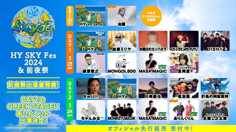 HY主催による世界一クリーンな音楽野外フェス<HY SKY Fes 2024 &前夜祭>が2024年3月22日、23日、24日の3日間にわたり沖縄県総合運動公園・多目的広場で開催される。同フェスの前夜祭出演アーティストおよび本編追加出演者が発表となった。